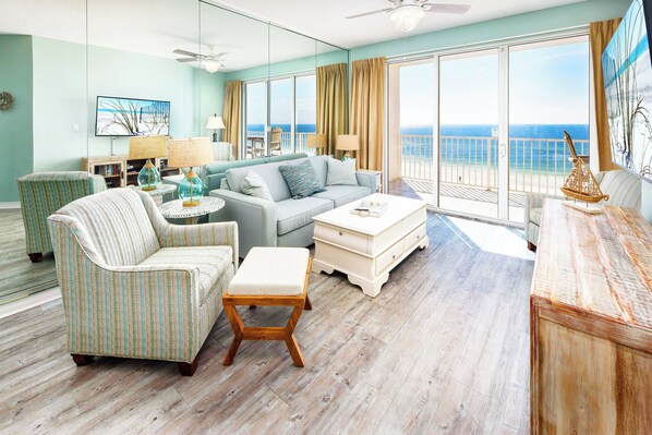 Vacay in style in this top-floor beachfront condo with a direct ocean view. The scenery from your very own private 7th floor balcony goes on for miles and you cannot get a better front-row seat to watch dolphins dance in the crystal clear ocean surf.