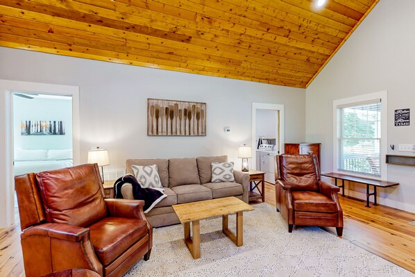 When you’re not hiking, fishing, rafting, or basking in the scenic overlook views, come back to relax in the beautifully designed living area adorned with comfortable furnishings and stylish decor with rustic accents. Stream family movie night on the large smart TV or get cozy with a good book by the wood-burning fireplace. The inviting, full kitchen hosts modern appliances, gorgeous cabinetry, and ample storage space for effortless mealtimes. Even better, grill up the day’s fresh catch on the spacious deck while others leisurely float back on the river, conveniently arriving right at the front door! As the evening draws to a close, come together around the firepit to create lasting memories, share laughter, indulge in s’mores, and revel in the soothing river sounds just beyond your reach.