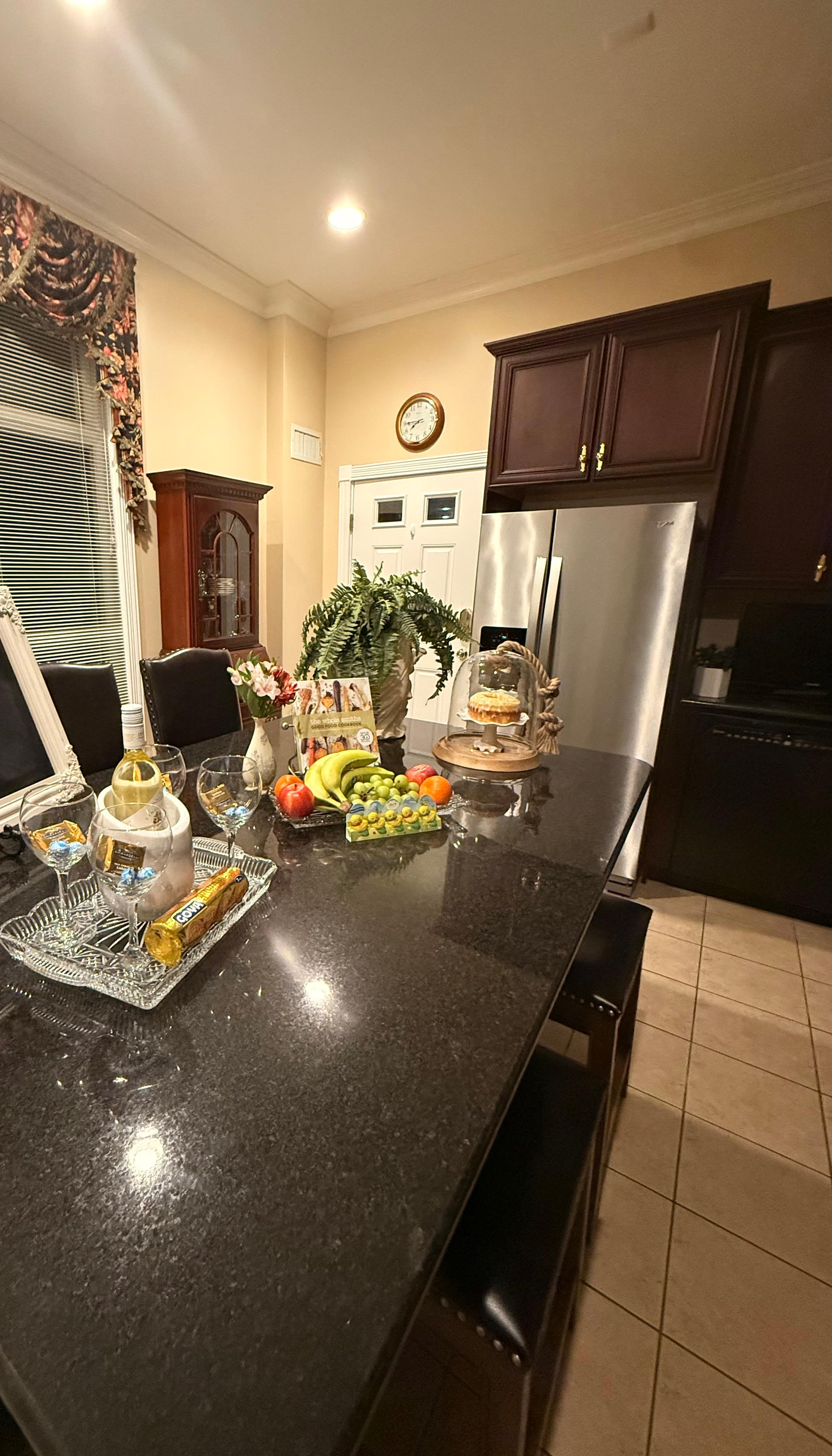 Gourmet, fully equipped kitchen with granite countertops, custom cabinets, full-size appliances, Keurig, and essentials
