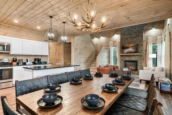 That leads to a tastefully designed interior! On the main level, two bedrooms await, each featuring a king-sized bed, a smart TV, a nightstand, and a lamp, accompanied by a full bathroom. The kitchen and dining area are fully stocked with contemporary appliances, offering ample seating for meals and gatherings. Relax in the expansive living room, equipped with a television, cozy sofa, and a fireplace that elevates the ambiance.