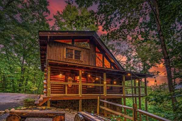 A bubbling hot tub completes the outdoor experience. Positioned thoughtfully on the deck with warm evening lighting, it is another gem from which guests can enjoy a relaxing soak and take in the beautiful natural surroundings. Additionally the outdoor fire pit area, with real log seating and string lights, offers a charming spot for evening gatherings. A charcoal grill is available for cookouts under the starry sky. When you're ready to explore the surroundings, you'll find this extraordinary getaway is just a few short minutes to Pigeon Forge, Gatlinburg, and Dollywood.