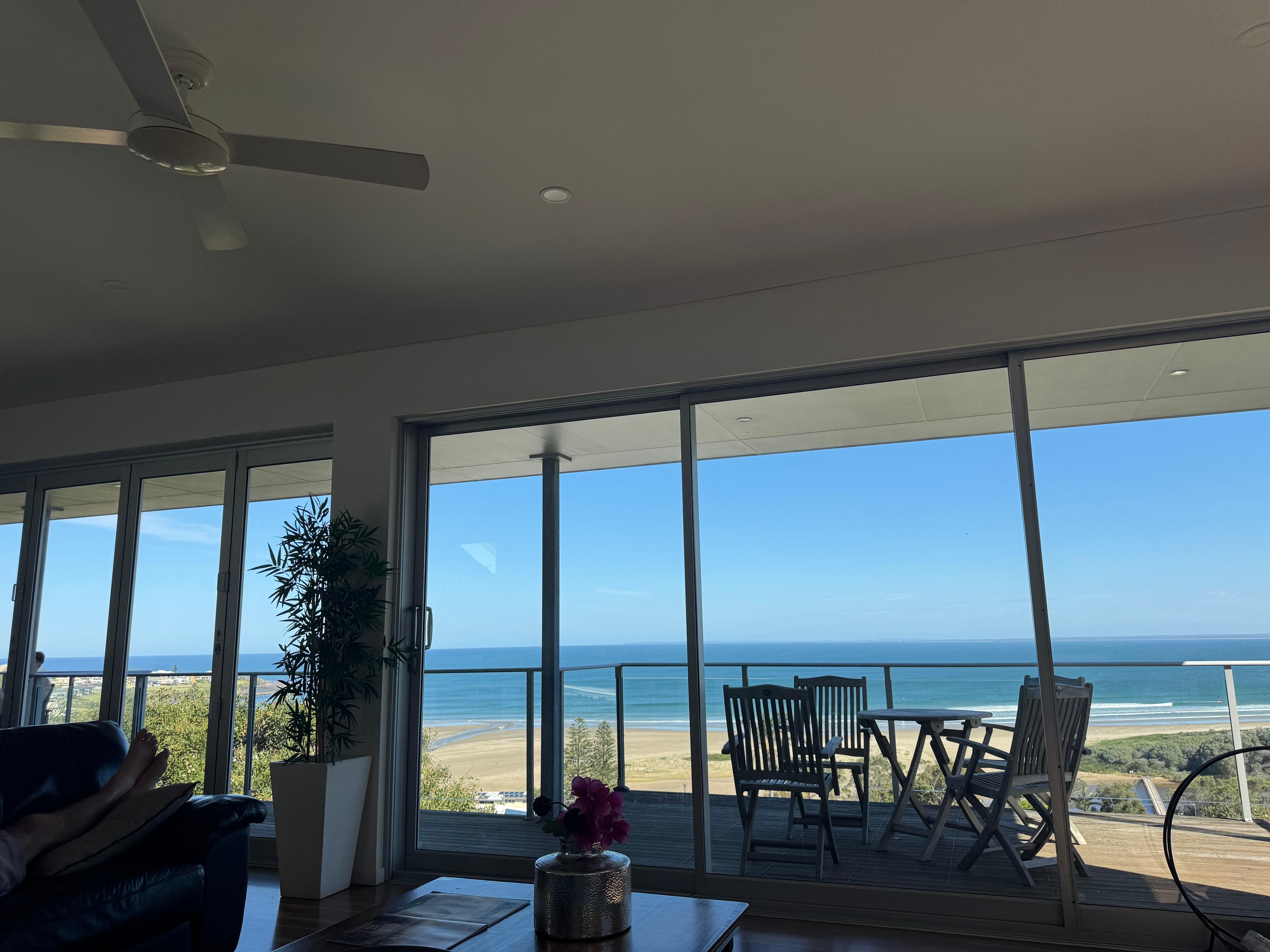 Blue Salt Gerroa is a luxurious hillside house with spectacular, panoramic, uninterrupted views of the Pacific Ocean, the Seven Mile Beach and the Crooked River. The house is elevated, being located at one of the highest points in Gerroa, allowing for expansive and extensive sweeping water views in all directions. These views can be seen for miles and miles from two large decks and internally through a very wide 16 metres of glass panels and doors, which open to the decks.