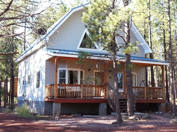 See the stars through the skylights from the new king size bed in the master and the new queen bed in the loft. Both king bedrooms have a tv and dvd player, first floor bedroom has a vcr as well, and an assortment of vhs and dvd movies. The fully stocked kitchen includes everything you need, bring your groceries and make a simple or gourmet meal. The laundry room includes linens and towels. Outside relaxation on the deck, the rustic fire pit area or the front porch. We also provide super fast STARLINK INTERNET!! Again, so many fun activities (winter and summer) are nearby, including the Grand Canyon, Sedona, Grand Canyon Railway/Polar Express, Bearizona, the Deer Farm and Canyon Coaster Adventure Park, as well as museums, observatories and outdoor recreation such as fishing, hiking, skiing, sledding and more. This home will not disappoint you! Check in is after 4pm and checkout is before 11:00 am.