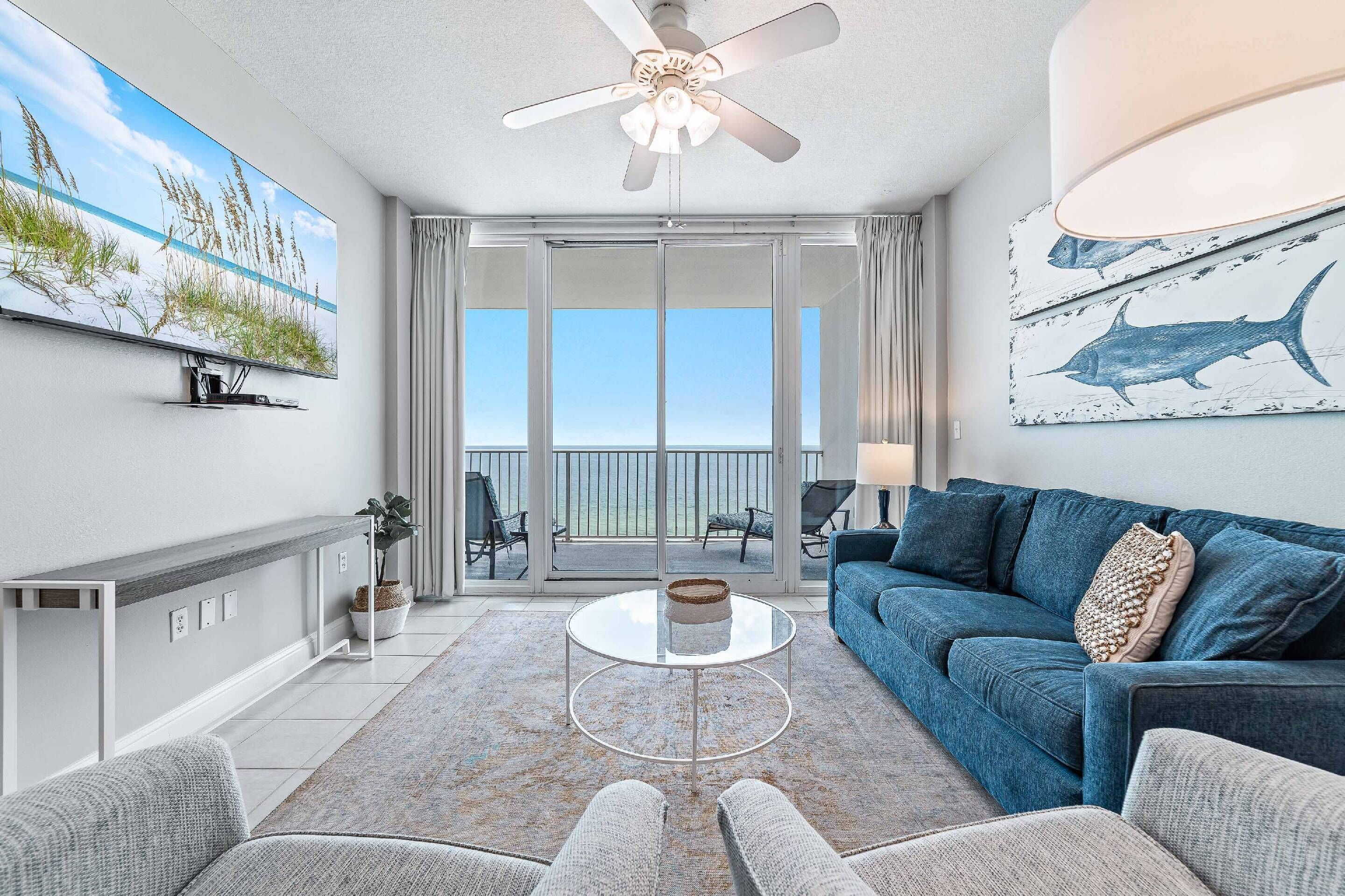 Living Room: Cozy seating, a queen sleeper sofa, flat-screen TV, and Gulf views from the balcony.