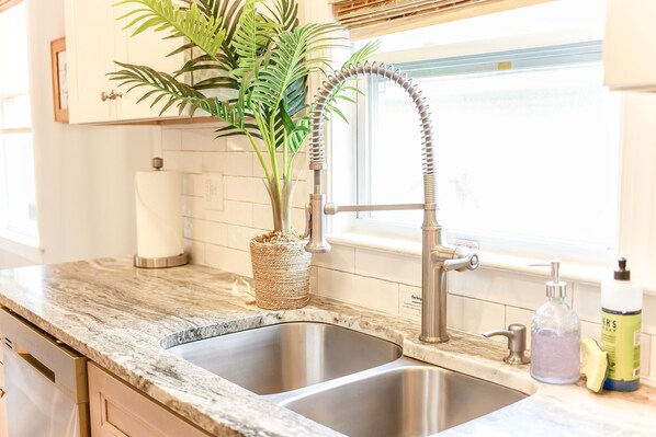 We have the home stocked with a starter kit for your stay including a roll of paper towels, extra trash bags for the kitchen, laundry soap, sponge and dish liquid, dishwasher liquid, shampoo, conditioner, body wash, hand wash, and 2 rolls of toilet paper per bathroom.