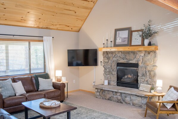 The perfect combination of cozy yet spacious, the cabin is 2,300 square feet with 3 bedrooms, a loft, and 2.5 bathrooms, and sits on an almost-acre lot. This home comes equipped with everything you need for a warm relaxing stay indoors in the winter… games, puzzles, family movies, popcorn, hot chocolate, coffee! Looking to get outdoors in the summer? Enjoy a friendly game of corn hole, hold a ping pong tournament, host a cookout outside on the grill, or watch the kids climb and swing on the outdoor playset! The open floorplan allows guests cooking in the kitchen to be part of the action! The oversized-butcher block island seats 5, which adds additional seating space for movie nights. Cozy up on one of the soft leather couches in front of the gas fireplace, brew some fresh coffee at the coffee bar in the kitchen, work a puzzle in the sun-filled dining room, play a game upstairs in the large loft overlooking the great room… all these spaces are connected! The loft has some brand new additions including a hand-built 8' shuffleboard table, a Streetfighter arcade game, and an Infinity game table. Kids and adults alike can disconnect and chill or find plenty to do inside and outside!