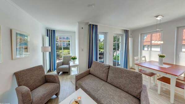 SOUTHERN BALCONY AND MODERN EQUIPMENT, ADJUSTABLE CHAIR, only approx. 100 m to the BEACH PROMENADE! Comfortably furnished 3 - room apartment with very good equipment! 2 separate bedrooms, 2 bathrooms (1 bath and underfloor heating, 1 shower room), living area with kitchen and dining area and south-facing balcony with furniture. The apartment has a parking space in the hotel's own underground car park. Bicycle storage is available. From the house you can reach the center and the well-known Ahlbecker pier in about 2 minutes on foot.
