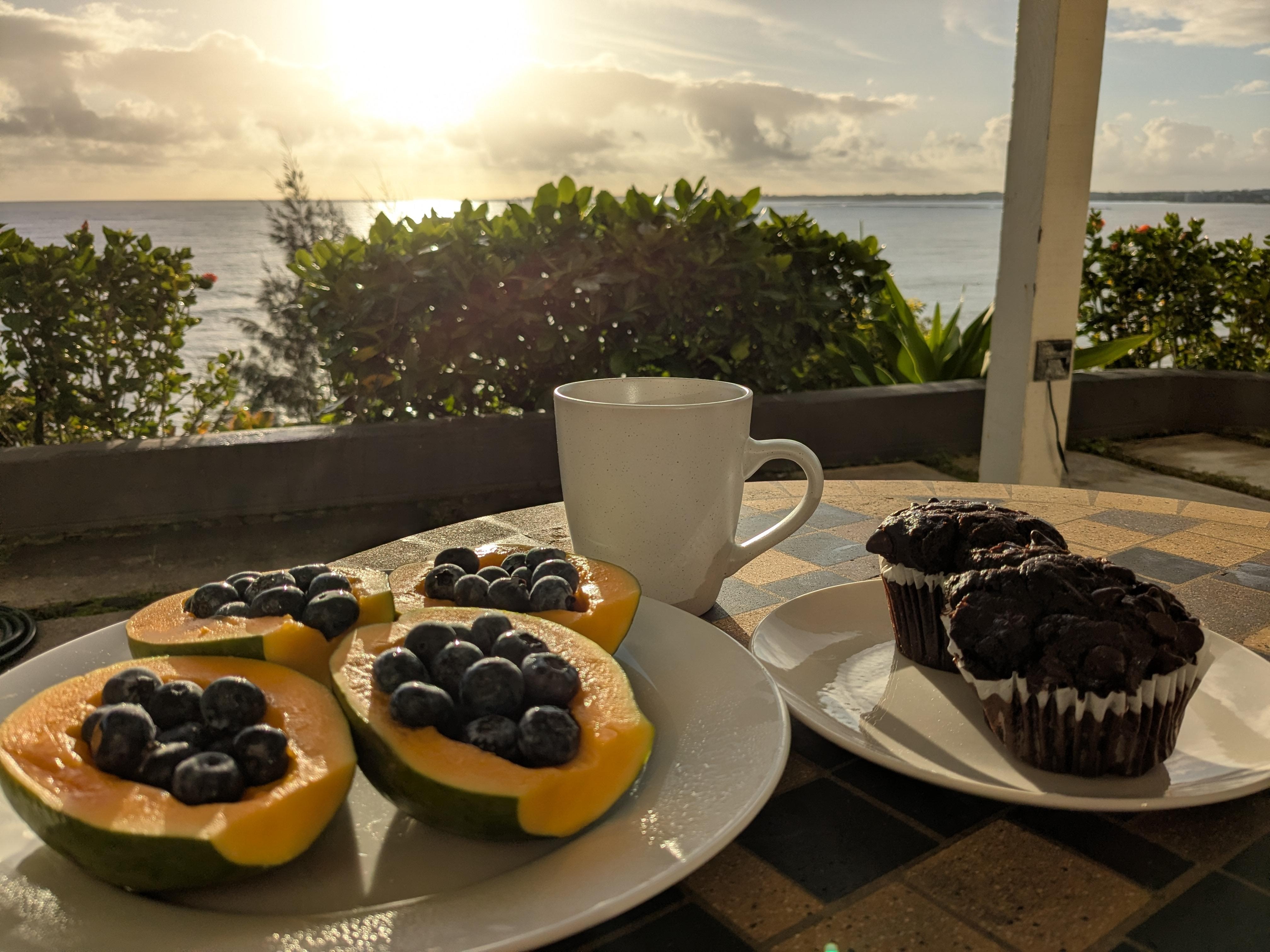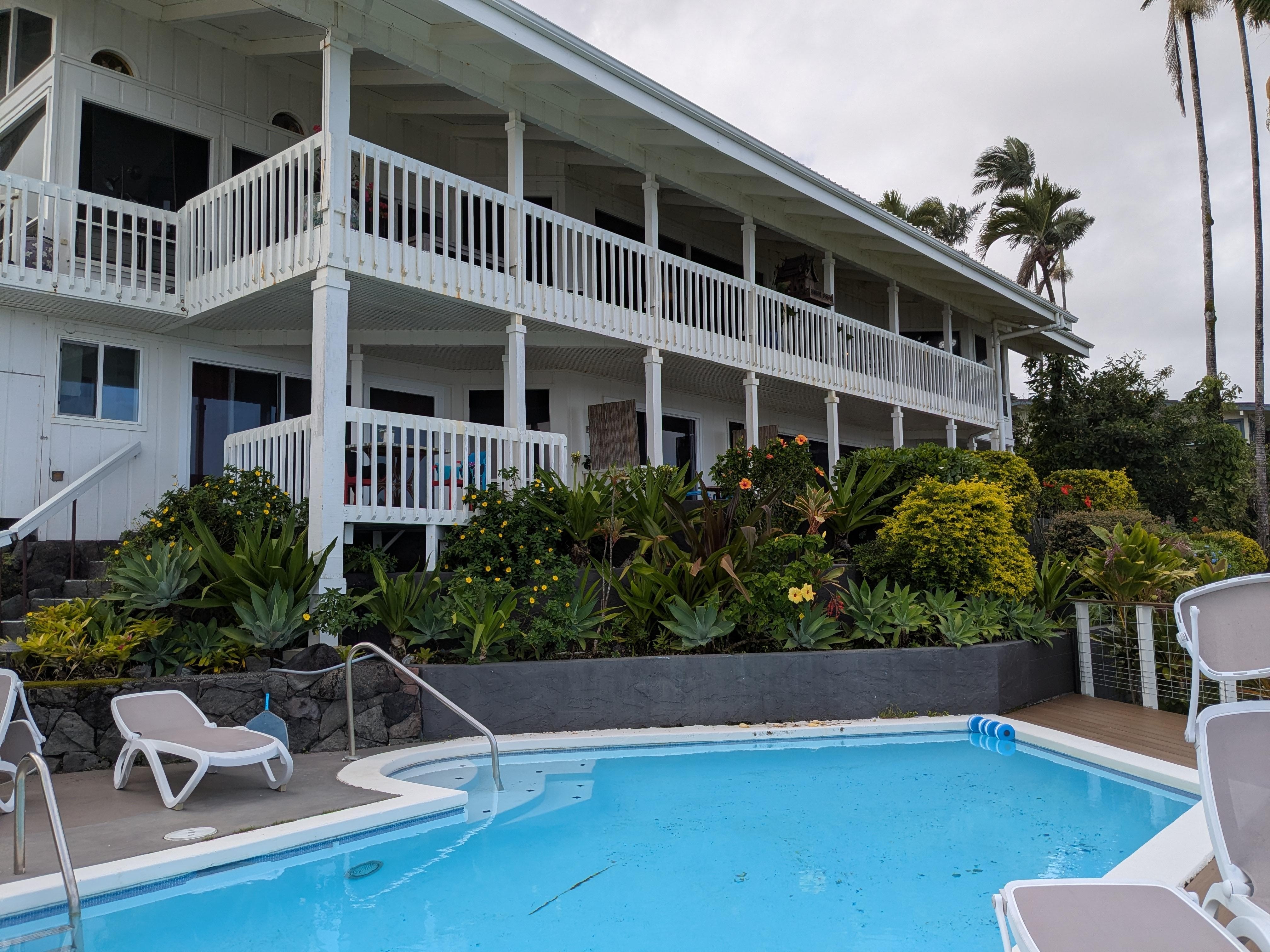 The weather in Hilo was very overcast most of the time we were there, which is something that obviously can't be controlled. The amazing part was that the view was still beautiful even with the drizzly weather. There were always surfers to watch from the pool area. We didn't use the pool or hottub. I did do yoga one morning by the pool. There was a beatiful sunrise the last morning we were there. The table and chairs outside our room were under a little overhang, so we could still sit outside and enjoy coffee or breakfast in the morning. Speaking of breakfast, my husband LOVED the muffins that were provided eahch day! I appreciated how environmentally friendly they were with even providing a little composting container for our food waste. There was a refrigerator with a freezer in our room and a larger refrigerator and freezer in the common room if needed. The room was very large, so we had plenty of space. The flowers along the stair walkway from the parking space to the room were lovely. There were whales spouting out in the bay each day. They were pretty far out, but it was still exciting to see! When I had questions, they got back to me right away and were very kind.