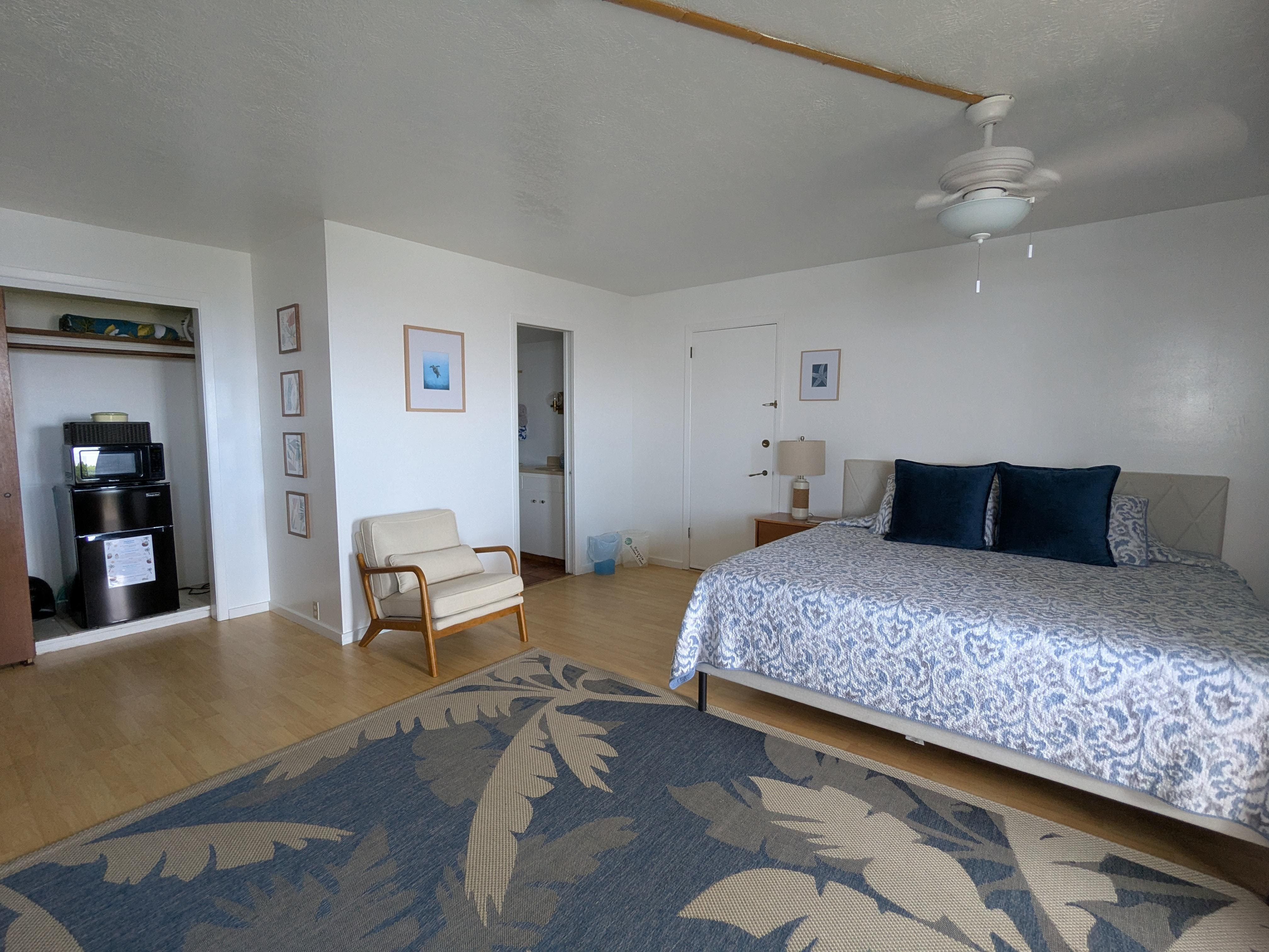 The Moana Room is a large room with king bed, small table with chairs, desk, WiFi, SMART TV, private bathroom with shower, small fridge/freezer, microwave, coffee maker, hot water pot, toaster, dishes and utensils, ceiling and portable fan, no air conditioning and sliding door to lanai. Continental breakfast items are stocked daily and we invite all guests to swim in the pool or lounge on our oceanfront lanai.