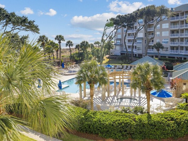 The grounds of the Hampton Place complex are extensive with multiple pools, including a family pool, baby pool, a separate adult pool, as well as a hot tub. They also include gas grills and dining area, gazebo, boardwalk to the beach and a private fitness center. Bike paths and a Palmetto Dunes shuttle during most seasons connect to golf courses, kayak and canoe facilities, shopping, and restaurants.