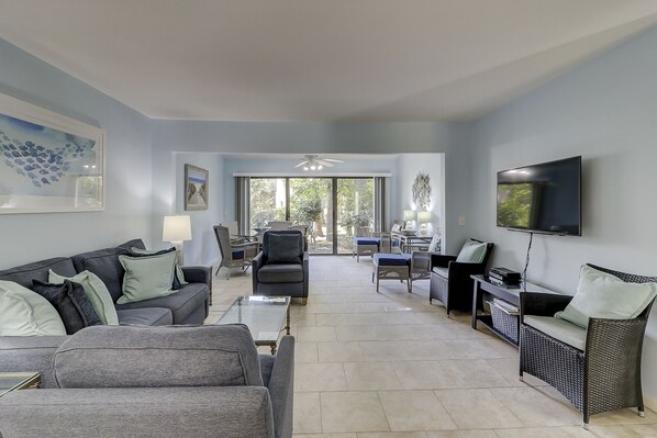 834 Ocean Cove is a spacious 3 bedroom, 3 bathroom townhouse located just across the street from the ocean! This property features an open floor plan with tile flooring throughout the living areas. The living room features a comfortable seating, a flat screen TV and a table set with four chairs- perfect for playing games or eating breakfast while admiring the island views! Just off the living area, you’ll find sliding doors that lead to a patio with additional seating.