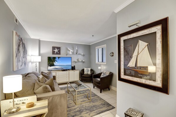 Welcome to OCEAN'S EDGE - a comfortable and delightfully designed Vacation Ready Services condo located at Hilton Head Resort! Located on the 3rd floor of Building #4, this two bed & two bath island getaway is the perfect retreat for families, friends, and everyone in between. As you step inside, you'll be greeted by the spacious living room. Enjoy all of your favorite movies & shows on the Smart TV that also comes with Cable channels! The open floor plan seamlessly connects to a fully equipped kitchen featuring modern appliances and all the cookware you might need to cook up some vacation meals.