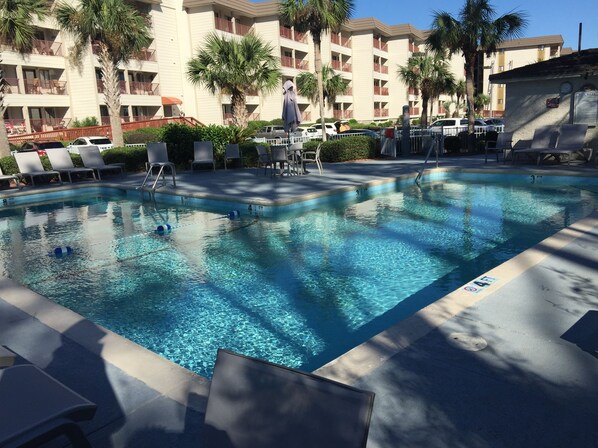 There is a small pool beside our Admiral's Row building as well as another very large pool on the North side of the complex with a kiddie pool beside it. There you will also find lots of lounge chairs, tables with umbrellas, a sun deck, a shaded sitting area, beach volleyball and organized activities in season.