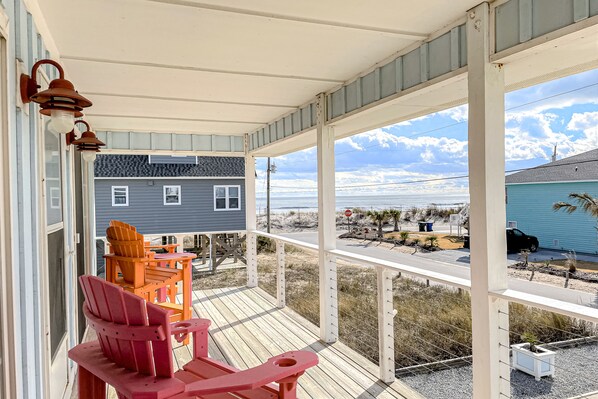 Ocean-view home 1 block from the beach with covered deck, patio, & EV charger