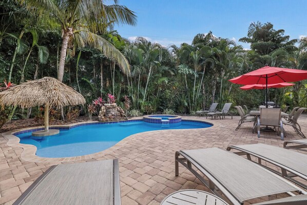 Step into the backyard paradise, where a saltwater pool, bubbling spa, and cascading waterfall await your indulgence. Challenge your companions to a game of ping pong or practice your putting skills amidst the tropical foliage. And when it's time to unwind, sink into one of the poolside loungers and let the island breeze whisk your worries away.