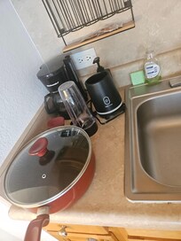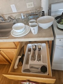 The kitchen is equipped with the bare minimum. It has 3 plates, 3bowls, 3 cups, some flatware, and a dull knife. No cutting board (so bring a cheap nylon cutting board with you). There's a small 3qt stainless steel pot that I was able to use to make rice. It has a very scratched up teflon/PFAS- coated pan (I elected to buy a cheapish stainless steel fry pan from Ala Moana Target instead).
