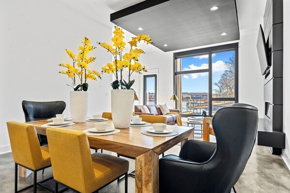 Gather and connect in the beautifully designed living areas of each home. Large windows fill the spaces with natural light, while sleek fireplaces and comfortable furnishings create a welcoming atmosphere. Adjacent dining areas are perfect for shared meals or board games, and the kitchens, outfitted with premium appliances and spacious islands, make meal prep enjoyable and easy.