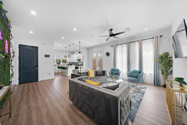 ✹ Open-concept living room w/ 58” flat screen smart TV