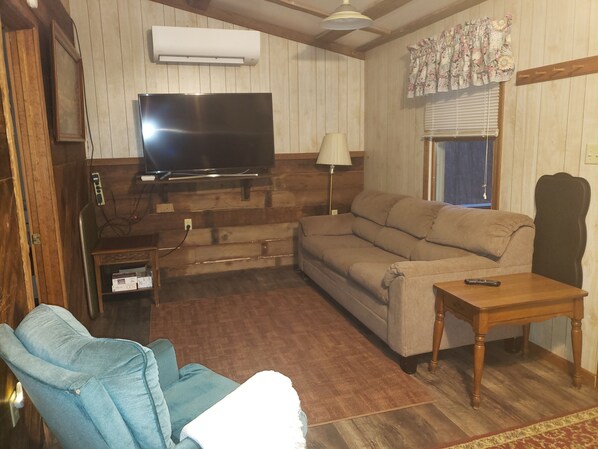 Relax and unwind, enjoying the natural surroundings inside and outside of this cabin. The cabin is furnished much the same as a small house. The living room has upholstered furniture and offers cable TV, internet/wifi and there is also a DVD player. The kitchen includes a full size electric range with oven, full-size refrigerator, microwave oven, coffeepot, toaster, cookware and dinnerware. The dining area has a table with 4 chairs. We provide pillows, blankets and bedspreads. Guests bring their own sheets and towels. The bedroom has a queen-sized bed and there is a queen sleeper sofa in the living room We provide toilet paper, paper towels, dish soap, dish towels and a bath mat. The bathroom has a shower (no tub), toilet and sink.