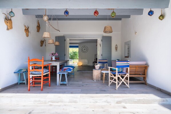 With its gardens facing east and west, this house offers several relaxation areas sheltered from view. The covered terrace is perfect for shaded meals and moments of relaxation on the sofa. Two wooden terraces equipped with five deckchairs allow you to fully enjoy the Mediterranean sun. A gas barbecue is available for convivial meals outdoors. Direct access to the sea makes going back and forth between the beach and the house particularly practical.