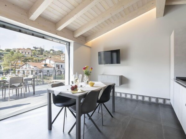 Modern, very comfortable residence "Al Bistrot dei Vinai", 2 storeys, built in 2022. 6 apartments in the residence. In the district of Caramagna 1.5 km from the centre of Imperia, 25 km from the centre of San Remo, 90 km from the centre of Nizza, in a sunny position in the residential district, 1.5 km from the sea. For shared use: large, well-kept garden 1'000 m2 (fenced) with lawn and flowers, lawn for sunbathing, swimming pool (5 x 15 m, depth 140 cm, seasonal availability: 12.Apr. - 30.Oct.). Outdoor shower, terrace, garden furniture, barbecue, children's playground (slide), pool maintenance by the owner/gardener. In the house: lift, storage room for bicycles, air conditioning, washing machine, tumble dryer (for shared use). Room cleaning on request (extra). Storeroom available. Motor access to the house. Parking (for 6 cars) on the premises, communal covered parking. Shop, grocery 600 m, supermarket 1 km, shopping centre 1 km, restaurant 2 km, bar 1 km, bakery 600 m, café 2 km, bicycle rental 2 km, bus stop 100 m, railway station "Imperia Oneglia" 6 km, sandy beach "Borgo Marina" 3 km pebble beach "Borgo Prino" 2 km, rocky beach "Borgo Foce" 3 km, outdoor swimming pool 6 km, swimming bay 6 km, bathing lake "Laghetti di Lecchiore" 7 km. Cycle lane 2 km. Nearby attractions: Dolcedo Mountainbiken am Monte Faudo 7 km, Küstenradweg von Imperia bis Ospedaletti 2 km, Valloria das Dorf mit 150 bemalten Türen 8 km, Triora Hexendorf 45 km, Monte Carlo 75 km, San Remo 25 km. Hiking paths: Monte Faudo (1149 m) Mountainbike Trails. Please note: car recommended. Baby equipment (included). Additional accommodations can be booked.