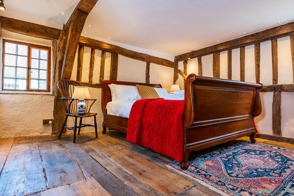 Charming medieval cottage courtyard garden and wood burner in serene Kersey