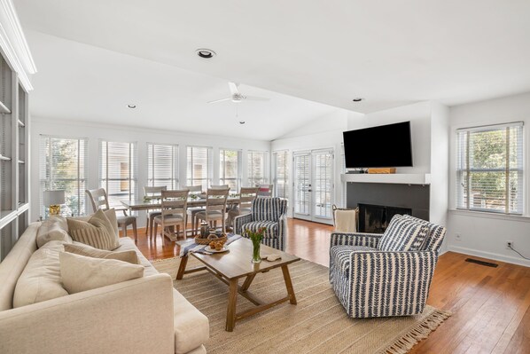 The second floor has the primary bedroom- with a King bed and a recently renovated en suite bathroom. The 4th bedroom has a King bed and a recently renovated en suite bathroom with a large walk-in shower. Both bedrooms have access to the lovely screened-in porch, comfortably furnished to enjoy the soft sea breeze.