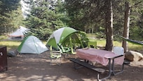 As Tent Cabins têm duas paredes de madeira, 2 paredes de lona e um teto de lona. Cada parede tem 2 beliches retráteis com um colchão fino. Não disponibilizamos tomadas elétricas. Os hóspedes devem trazer roupa de cama. Um número limitado de sacos de dormir está disponível na recepção. As cabanas têm fogões à lenha para aquecimento e uma mesa de piquenique com uma área para churrasco no pátio. Os banheiros públicos estão localizados a uma curta caminhada das barracas, enquanto os chuveiros estão localizados na lavanderia da vila por um custo adicional.