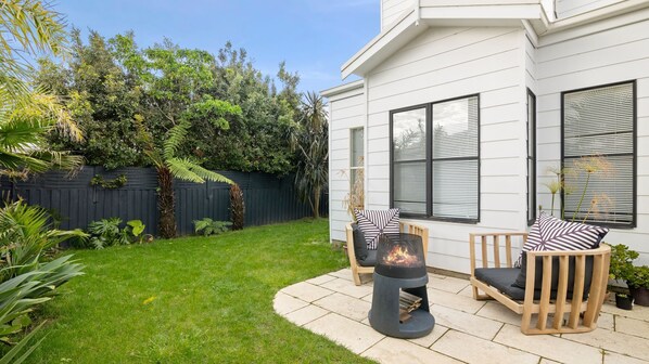 Outside, you'll find a delightful living area with outdoor seating and a BBQ, perfect for alfresco dining and entertaining. It's an ideal spot to gather with family and friends, enjoying meals in the fresh air and soaking up the summer sunshine.
