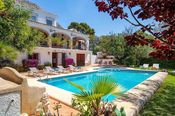 Located in the famous resort of Javea, the beautiful Villa Jacqueline proudly sits amidst lush greenery on all sides, with Mount Montgo standing tall in the backdrop, and the Baetic mountains bordering its distant horizon. This stunning 7 bedroom villa offers a spacious exterior with a large pool that is perfect for spending relaxing days under the Spanish sun. From here, the centre is only 10 minutes’ drive away and the sandy Playa Arenal is within 15 minutes’ drive. Head out to explore the coastal town of Javea known for its ancient streets and Mediterranean climate. Pool heating and WiFi are available, along with air conditioning/heating in all the bedrooms.