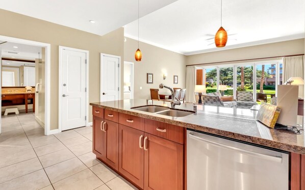 Relax in total comfort in this 2-bedroom, 2-bathroom villa that offers expansive views of the lush tropical grounds, open green spaces, and majestic Maui mountains. The villa is designed to bring the outdoors in, with large folding lanai doors that open to create a seamless indoor-outdoor tropical retreat. Whether you're dining al fresco or enjoying your favorite beverage, the spacious lanai provides the perfect setting for relaxation and taking in the stunning surroundings.