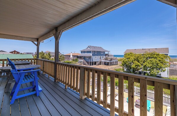 This cottage offers Ocean Views from both covered porches and features open decks. Two bedrooms have beautiful ocean views with sliding glass doors leading to decking. Enjoy your dinner while watching the sunset over the sound from the open decks. A private walkway to the ocean is just steps away, next to the neighboring house. The pool is heated for FREE in the spring and fall!