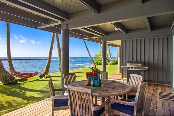 Covered oceanfront lanai with dining table and gas BBQ on the lower level