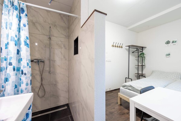 This is the smallest room in the house, but it’s designed with comfort and functionality in mind. You’ll find a comfortable double bed, a private in-room shower, Smart 4K TV, free Wi-Fi, and a water kettle for your morning coffee or tea. It’s ideal for solo travellers or couples who value simplicity, cleanliness, and a convenient location.