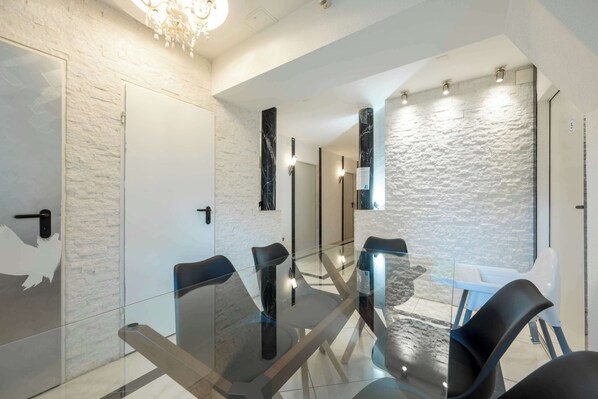 -a small dining area and the shared entrance space
