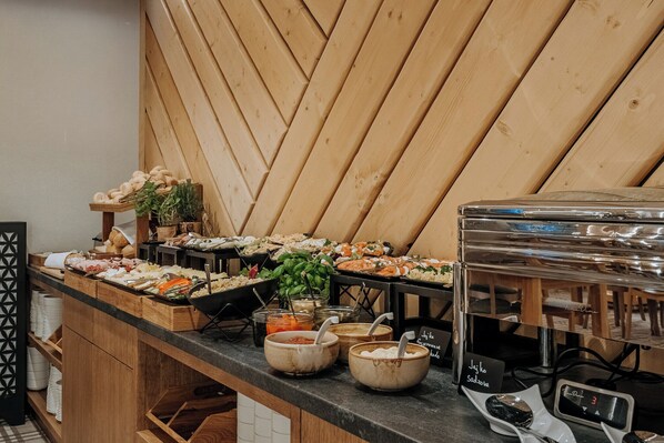 Café da manhã com buffet grátis disponível todos os dias entre 8h e 10h