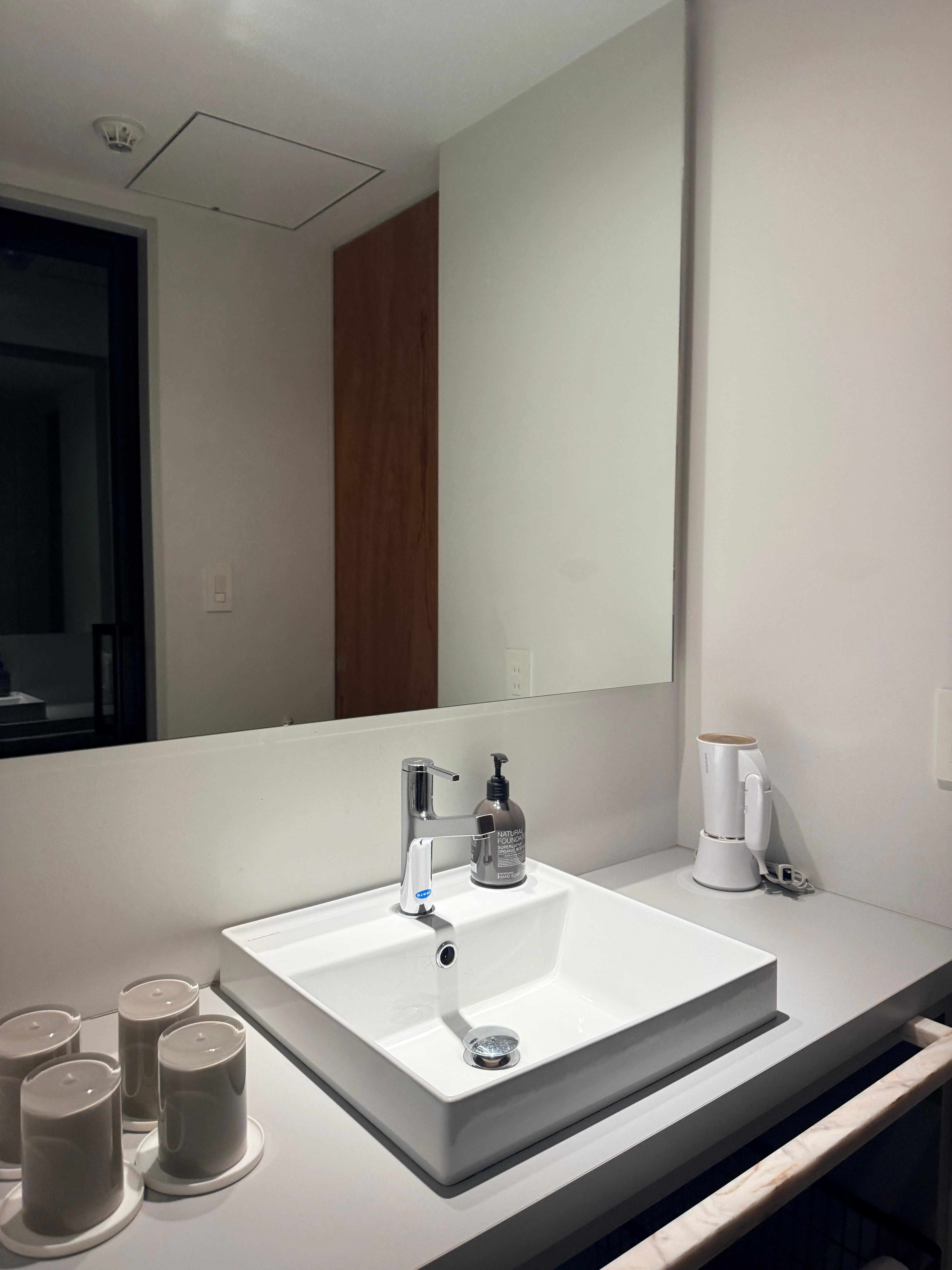 Very spacious room, friendly staff, great lounge. They provide you with 2 carafes in the room that you can fill in the 4th floor lounge. We used the lounge frequently and it was a great gathering space. Saw many people using it to enjoy a meal at the long table. There is cutlery, plates, bowls, microwave. The hotel has 2 laundry machines. Very popular so we used the ones next door instead. The location of the property is amazing, so many stores and restaurants directly outside and convenient short walk to many things. It really made it easy for us.