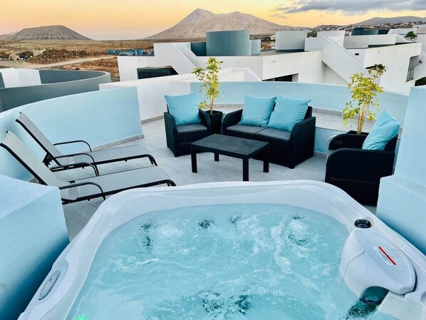 FUERTEVENTURA AZUL Vv - Solarium, Panoramic Terrace & JACUZZI With Views of Mountains, Volcanoes, Lanzarote Coast, Isla de Lobos, Lajares, El Cotillo and Corralejo AZUL Vv - Solarium, Panoramic Terrace & JACUZZI With Views of Mountains, Volcanoes, Lanzarote Coast, Isla de Lobos, Lajares, El Cotillo and Corralejo Super Host Vv Apartments S.L COMPANY INFORMATION Hello, I am Martin, responsible for the company SUPER HOST VV APARTMENTS S.L. (Luxury Holiday Apartments for rent in Fuerteventura) Always at the service of the guest and his comfort trying to provide solutions, ideas and unique experiences. At your disposal 24hs/7 DESCRIPTION OF THE ACCOMMODATION APARTAMENT "AZUL Vv"- NEW LUXURY ACCOMMODATION, HIGH QUALITY DESIGN, FIRST FLOOR WITH STAIRCASE TO A PANORAMIC TERRACE WITH VIEWS, SOLARIUM AND JACUZZI®. AIR CONDITIONING, HEATING by radiator and JACUZZI®. Impeccable with details not shown in the photos. We have High Speed and Quality Wifi Fiber Optic connection, ideal for TELE-WORKING OR ENJOY STREAMING SERVICES. LIVING ROOM equipped with 55' TV with smart TV, Audio Bar by Bluetooth ENERGY SYSTEM of great SOUND QUALITY! MATRIMONIAL BEDROOM, double bed, 32' TV with SAMSUNG smart TV, direct access to the BALCONY overlooking the pool, designed to enjoy alone or in company. FULL KITCHEN, cooking utensils, cutlery, DISHWASHER, VITROCERATOR, MICROWAVE, OVEN, FRIDGE, FREEZER, we have ORANGE EXPRIMATOR, BREAD TOASTER, ELECTRIC WATER HEATER. AS A COURTESY, we always leave pieces of fruit, bread, jams, butter, water and DOLCE GUSTO capsules for breakfast on the first day! FULL BATHROOM, floor-level shower tray, full sliding shower screen, SHAMPOO, SOAP, BATH SPONGE, CONDITIONER, HAIR DRYER, TOWELS. LAUNDRY ROOM, with WASHING MACHINE, ELECTRIC DRYER, STAND, IRONING BOARD, IRONING IRON, utensils and cleaning products. PANORAMIC TERRACE on the first floor, with sun loungers, outdoor furniture and JACUZZI®. BEACH and POOL You won't need to bring anything! The flat is equipped with CHAIRS, SUN SHADE AND TOWEL SET FOR THE BEACH, POOL or JACUZZI®, and for more fun games and entertainments for children and adults on the beach as well as at home; BALLS, SHOVELS, WATER GAMES, TABLE GAMES, such as TRIVIAL, CHESS, CARDS. This residence is the most beautiful of the island of Fuerteventura. It is new, quiet, modern and very well maintained thanks to the gardeners and employees. The swimming pools are great! In total there is 1 swimming pool for adults and 1 for children, surrounded by beautiful gardens with native plants and volcanic stones. The urbanisation has a security service and access control. SUPER HOST VV APARTMENTS S.L, adds 24hs alarm service from SECURITAS DIRECT and CAJA FUERTE in its flats AZUL Vv and AMARILLO Vv. The staff of SUPER HOST VV APARTMENTS S.L. speaks English, Spanish, French, Italian and sign language (deaf people). The APARTMENT looks like a suite of a BIG LUXURY HOTEL but with the comfort of being at HOME. INFORMATION ABOUT THE AREA CASILLA DE COSTA is 9 km from Corralejo and provides free parking, it is located in Villaverde, it has a strategic location, it is VERY NECESSARY to rent a car as it is IMPOSSIBLE to move around without it, being the largest island, SUPER HOST VV APARTMENTS S.L. offers contact with Car, Surf, Windsurf and Bicycle rental service providers. SUPERMARKETS HIPER DINO (Lajares, Corralejo, Villaverde, El Cotillo), LIDL (Corralejo and Puerto del Rosario) MERCADONA (Corralejo, Puerto del rosario) ALDI (Puerto del rosario) MARKET Saturday: Craft market in Lajares. RECOMMENDATIONS CAFES AND BAKERIES El Archo (Lajares) Panateca (Lajares) El Goloso (Lajares) Confectionery Mi Dulce Hogar (Villaverde) Restaurants near the Apartment: CASA MARCOS (Villaverde) EL MAHON (Villaverde) EL MORAL (Villaverde) EL HORNO (Villaverde) LA ABUELA MARÍA (Villaverde) In Lajares: You will find a lively area, affordable pinchos, restaurants and pizzerias. In Corralejo you will find beach bars (Chiringuitos), for example the one on the beach of the RIU hotel. In El Cotillo you will find restaurants with fresh catch of the day, octopus, fish, seafood and fresh seafood. Corralejo has a great nightlife and during the day you can enjoy the tranquillity of its beaches and hiking trails such as the route of the oldest volcanoes of the archipelago and Fuerteventura. Caleta de Fuste (El Castillo) is 29 km from the property, while Puerto del Rosario is 18 km away. The nearest airport is Fuerteventura, 23 km from the accommodation, PLACES OF INTEREST: Surroundings of the accommodation MAP What's nearby? Malpais de la Arena - 4,2 km Corralejo Botanical Park - 9 km Paleontological site of Barranco de los Encantados or Enamorados - 9 km Mountain of TindayA - 10 km Cancha de Majada Marcial - 17 km Majada Marcial Park - 17 km Native flowers - 7 km Park of Fabelo - 17 km New urbanisation of El Charco - 17 km Garden City - 17 km Recommended Restaurants and Cafeterias Cafeteria/bar El Horno - 2,3 km Cafeteria/bar Restaurante Casa Marcos - 2,4 km Cafeteria/bar Casa Marcos - 2,4 km Cafeteria/bar Escanfraga - 3,2 km Cafeteria/bar Cafe Manduca - 3,2 km Café/bar The Return Bar - 3,9 km Tourist attractions of note Ecomuseum of Alcogida - 18 km Unamuno's House Museum (Fuerteventura) - 18 km Natural surroundings Escanfraga (The highest mountain in La Oliva) - 3 km (Hiking) Atlantico - 6 km Beaches in the area El Moro Beach - 7 km El Burro Beach - 7 km Corralejo Natural Park - 8 km El Pozo Beach - 9 km El Jablito Beach - 9 km Nearest airports Fuerteventura Airport 23 km Lanzarote Airport 43 km * All distances are calculated in a straight line. Most popular services Outside Outdoor furniture Outdoor dining area Terrace / solarium Barbecue Jacuzzi® Patio Balcony Garden Views Views to an inner courtyard Views to a place of interest Views to the mountain Views to the swimming pool Garden view Carbon monoxide detector Safety deposit box Languages English Spanish French Italian Catalan Sign Language Entrance : 15: