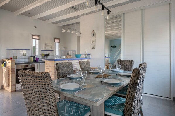 The house offers great comfort. The living area consists of a fully equipped American kitchen, with induction hobs, a refrigerator, a microwave, an oven, a freezer, a dishwasher, kitchen utensils, a coffee maker, a toaster, a kettle and a citrus press. This kitchen opens onto the dining room, a space that invites sharing moments around good meals, then onto the living room, a warm place ideal for discussing or relaxing in front of the television.