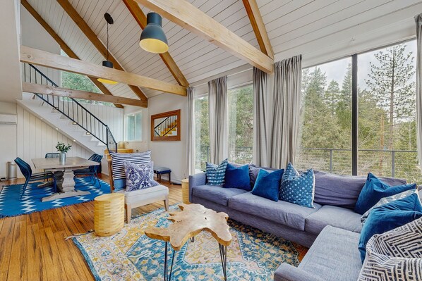 Step inside to discover an open-concept living space filled with natural light from large windows. The living room, complete with a TV, flows seamlessly into the dining area and a well-equipped kitchen featuring a six-burner range, perfect for whipping up delicious meals. A convenient bathroom and shower are also located on this level, making it easy for guests to freshen up after a day of exploring.