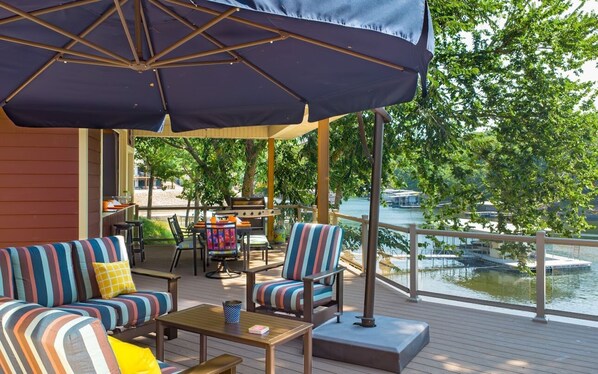 Your family will be close to everything when you stay at this centrally located place, off HH Bend. Enjoy your morning coffee on one of the decks and dock, a large open deck; imagine yourself enjoying a lovely afternoon on a cozy covered patio that overlooks a tranquil lake. And if that's not enough to entice you, picture yourself playing games with your friends and family in a fun game room with a stunning lake view from a cove deck area. It sounds like the perfect way to unwind and make unforgettable memories, right? A tranquil lake. And if that's not enough to entice you, picture yourself playing games with your friends and family in a fun game room with a stunning lake view from a cove deck area. It sounds like the perfect way to unwind and make unforgettable memories, right? A tranquil lake. And if that's not enough to entice you, picture yourself playing games with your friends and family in a fun game room with a stunning lake view from a cove deck area. It sounds like the perfect way to unwind and make unforgettable memories or be surrounded by nature. Bar area, outdoor comfortable seating. 3 Bedrooms come with complete bedding and bath towels & kitchen is well stocked. King, Queen, and Bunkroom with two twins/2 full. 2 Updated bathrooms. All new floors and many updates for the season. Full kitchen, lovely family room, and game room, large dock with swim deck. Full kitchen, gas grill, and trailer parking. Bring your boat! Plenty of flat parking. Gentle ramp down to the pier. Private dock and boat slip. Boat rentals close at Alhonna Resort.