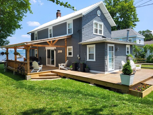 Welcome to our Lake House ! Our Lakehouse is a private lakefront home with our own dock a walk out beach area and large yard and ample room for 6 guest to RELAX and a parking area with ample room for cars & a trailer! We love our LAKEFRONT House and the location is fantastic! This is a 3-bedroom 2 full bath house that is situated right on the water, with our own dock. The master bedroom features a 14.5 " memory foam Queen-sized bed with non stop wonderful lake views. The 2nd bedroom is appointed with a full-sized bed. The 3rd has a queen sized bed. The main living space is open and spacious with wonderful views of the lake, with a wall of windows looking towards the lake and a 65" HD TV with many streaming channels to stream your shows and providers. The kitchen is new, with plenty of countertop space and some island seating for 4, there is a dining room table inside for group dining or board games. We have a large seating area indoors for movie watching or simply hanging out…although you'll probably spend more time outside! There is a large deck with a gas grill and plenty of greenspace on the lawn for games or simply playing! The outdoor furniture includes a 2-person hammock and outdoor dining set for al fresco dining and a picnic table in the backyard. While enjoying the large yard, don’t forget to bring some wood with you for campfires and make yourself comfortable on the Adirondack chairs that surround our fire ring situated lakeside. There are 2 kayas and bikes for your use. There is ample seating at the picnic table on the dock for enjoying coffee @sunrise or ice cream while watching sunsets. Enjoy a simple walk across the street for an ice cream cone! Yes! You are that close to the perfect summer! Sherman’s bay is close to most of Chautauqua's main attractions, such as the Chautauqua Institute, which is just about a 20-minute drive by car. We are only minutes from the cute towns of Lakewood, Jamestown and Mayville which has anything you would need. A 15-minute drive (20-minute boat ride) to Bemus Point. You are welcome to tie your boat off on our own secure boat cage on our OWN private dock during your stay (June - mid October) The water depth is at approx. 3 ft deep around our dock, so docking your boat should not be a problem. Don’t have your own boat? Not to worry! There are many boat rental options right down the bay. There is little you will be missing during your stay! Enjoy a quiet vacation in a clean, updated lakefront cottage with all the modern amenities! Come and enjoy a relaxing stay on Chautauqua Lake! Our lakehouse has so much to offer. Come for a romantic getaway, family vacation, friends trip, fishing trip or skiing. Ample Parking available for 3-4 cars, 1 trailer for guest only. Boat docking for 1 boat. All accomodations and ammenities are for registered guests. No gatherings, events or parties. Security cameras monitor paved parking,home, and boat docking areas for our safety and our properties security.This cottage is rented weekly during season Memorial day thru Labor day with Saturday check in & check out. I look forward to hosting you soon.