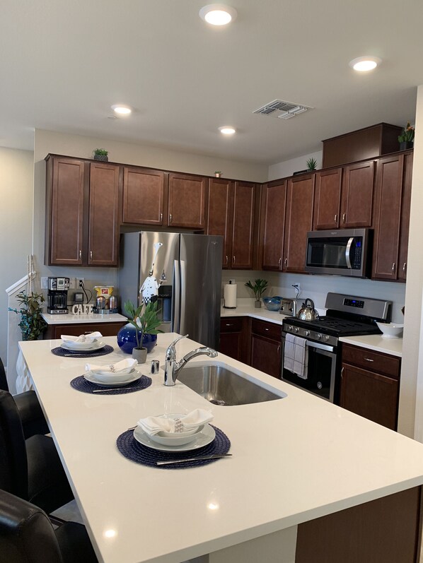 While there are MANY great selections for dining or take out nearby, you will find the kitchen to have everything to prepare any meal at any time. Our pantry is loaded with every pan and tool you will need. The new refrigerator can fit food for up to 9 at least a week. The dining table seats 6 and the island bar seats another 3.