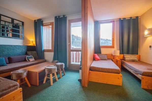 50m from ski slopes, 2nd floor, view resort, balcony, tv, ski locker, 27m², Valmorel