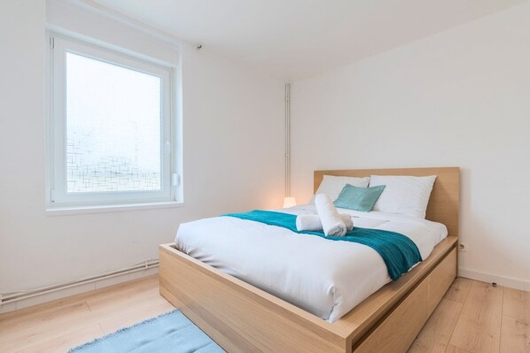 - Two bedrooms with double bed and work space (desk)