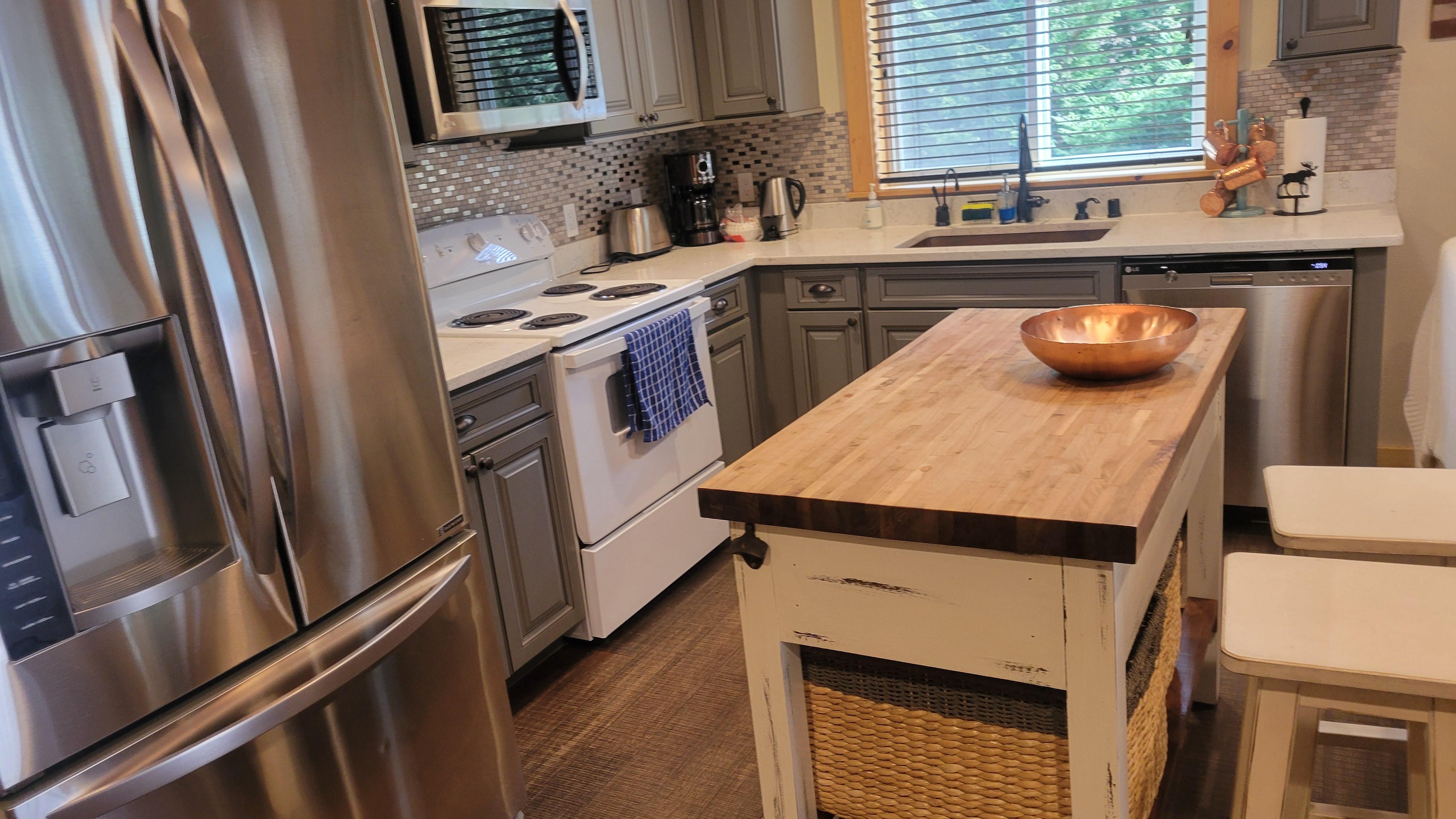 You can really escape the stress and everyday hustle and bustle in this gorgeous, very secluded home surrounded by nothing but trees and greenery. Loaded with all you could want with something to do for guests of all ages, this will make for the best home base for your next family vacation. The youngest ones in your group will love running and enjoy the playset set outside in the yard or the teens can shoot some hoops while you can sit back and relax in the hot tub. Your canine companions will also love it here with room to roam and inspect every smell of the tall evergreen trees and well-maintained lawn and garden. Come inside, cuddle up and enjoy watching a DVD (guest needs to bring DVDs) with your delicious dinner you whipped up in this beautiful full kitchen. The chef will have no trouble whipping up delicious meals with the stainless steel appliances, large island, and ample utensils just waiting to help out. Plus, when it is time to settle down a bit, the lofted bedroom upstairs will give everyone some privacy before hitting the hay!