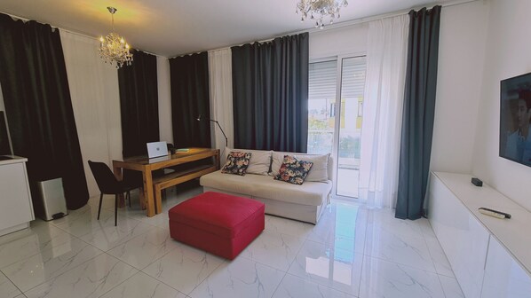 The apartment features a cozy bedroom, perfect for families, small groups and digital nomads. The bedroom is furnished with a comfortable double bed with an orthopaedic mattress. Premium linens ensure a peaceful night's sleep.
