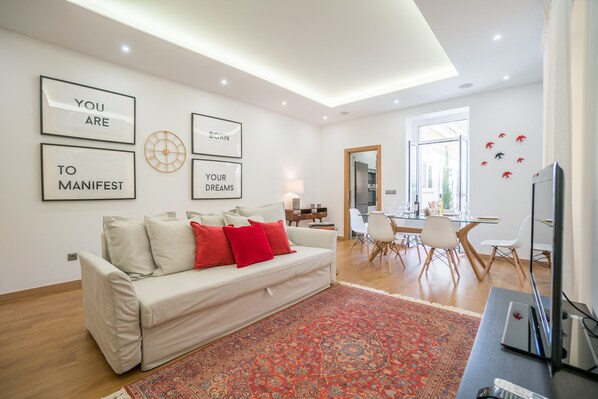 This is absolutely brand new 2 bedroom apartment is what you need for a perfect stay in Lisbon! Decorated by a prestigious interior designer, thinking of your best comfort this space is very cozy and beautiful. High tech kitchen (Simens), air conditioning, all the amenities are included! Amazing patio with barbeque and many green plants & flowers are awaiting you! Reinforced with the solar energy panels because we are also thinking about the environment. Super well located near Tagus River.
