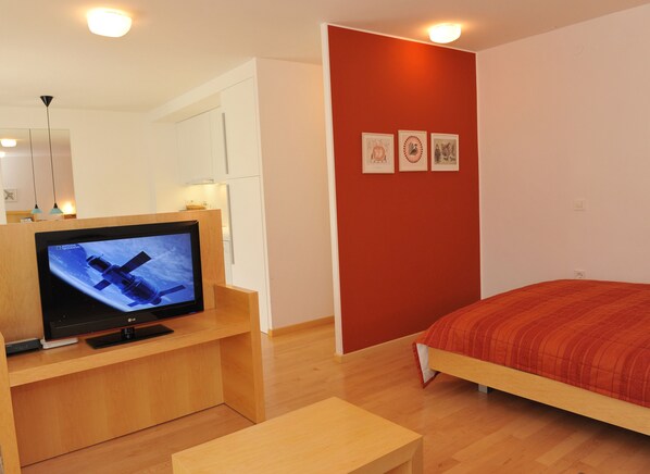 The studio has a bed (160 x 200 cm); there is a sofa next to it, which falls down to another bed (140 x 200 cm) and is air-conditioned. Sleeping area is connected to kitchen with dining table. Kitchen is equipped with kitchen utensils, cutlery, kitchen stove with oven, dishwasher and spacious refrigerator. The room has an exit to a covered balcony. Bathroom is equipped with shower, toilette and washbasin. There is also a washing machine in the apartment, LCD TV, CATV, telephone, free broadband wired and wireless (Wi-Fi) internet access, iron along with ironing board, hairdryer, bed linen and towels are provided.