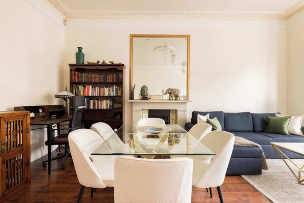 As you step inside, you’ll be greeted by a beautifully decorated living room, thoughtfully designed to create a stylish yet comfortable space where you can relax and unwind. Large sash windows line the apartment, flooding every room with sunlight and highlighting the generous proportions throughout.